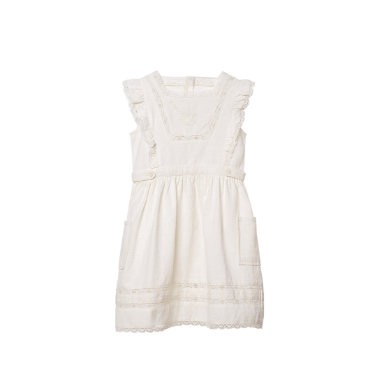 Apron dress with a defined waistline, gathered skirts, and pockets. Lace appliques and tone on tone embroideries. Back buttoned opening with mother-of-pearl buttons on Ivory color, and wooden buttons on Mustard yellow color. Lace bottom finishing.