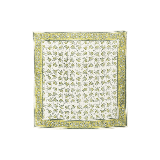 Foulard carré à imprimé floral jaune et vert sur fond ivoire. Dessin exclusif réalisé dans un block print.