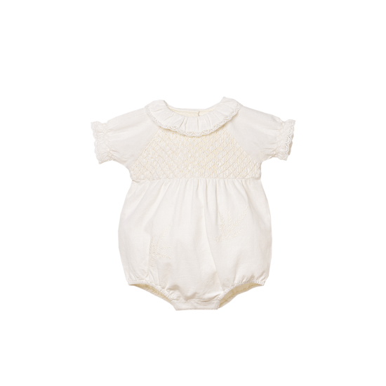Barboteuse avec empiècement smocké devant et dos et broderies ton sur ton. Collerette volantée bordée de dentelle. Manches courtes bordées d’un galon de dentelle avec détail smocké. Patte de boutonnage au dos avec petits boutons en bois. Boutons pression au niveau de l’entrejambe, cuisses élastiquées.
