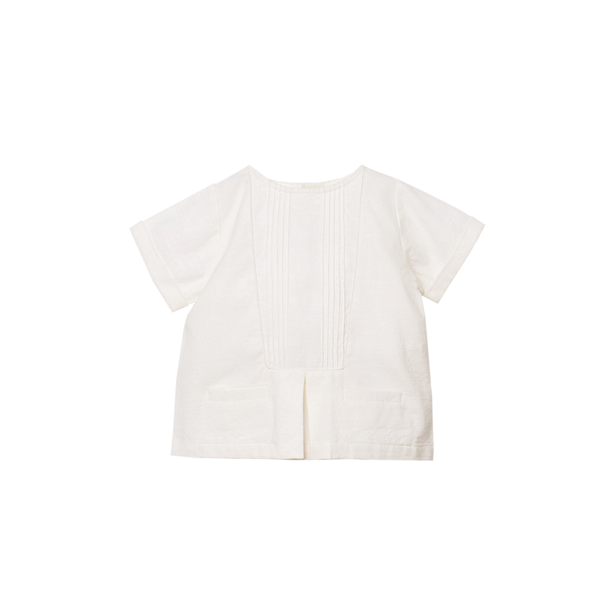 Top trapèze à manches courtes à revers. Grand plastron à plis nervure sur le devant, bordé d’un passepoil ton sur ton. Pli creux devant avec deux fausses poches. Patte de boutonnage dos avec petits boutons bois.