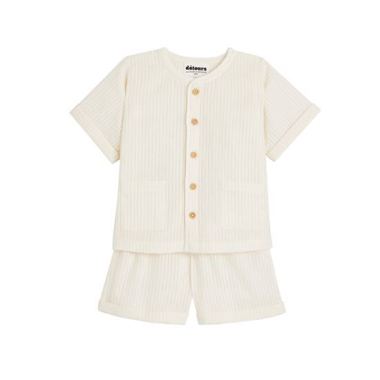 Top manches courtes à revers, et patte de boutonnage devant avec boutons bois. Deux poches plaquées sur le devant. Passepoil tressé ton sur ton à l’encolure, à la patte de boutonnage et à la découpe au dos.